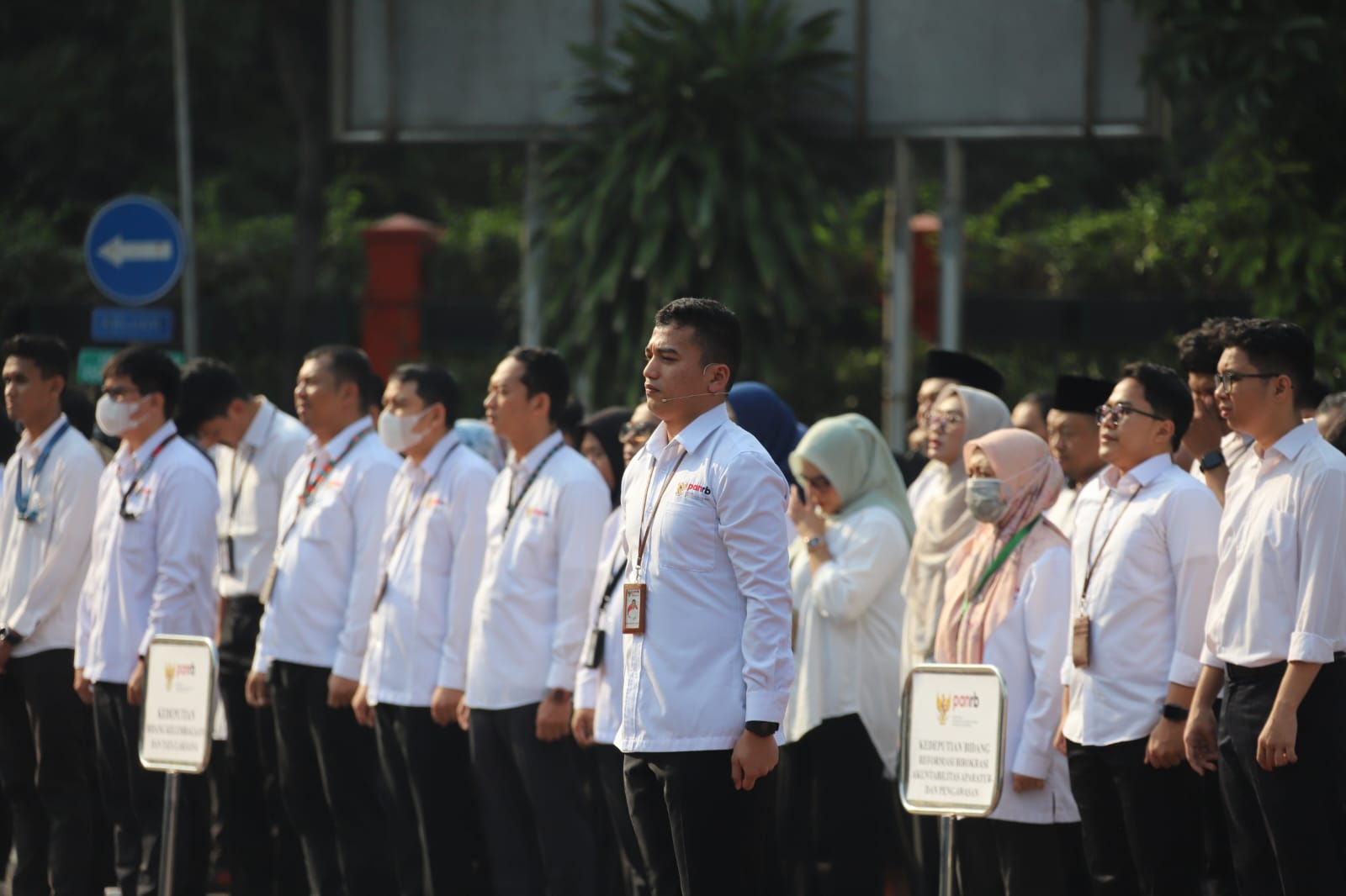 Kementerian Pendayagunaan Aparatur Negara dan Reformasi Birokrasi (PANRB) menyelenggarakan apel pagi di Lapangan Kantor Kementerian PANRB, Jakarta, Senin (11/09). Apel ini dipimpin oleh Deputi Bidang Kelembagaan dan Tata Laksana Kementerian PANRB Nanik Murwati. Seluruh pejabat dan pegawai Kementerian PANRB hadir dalam apel pagi.
