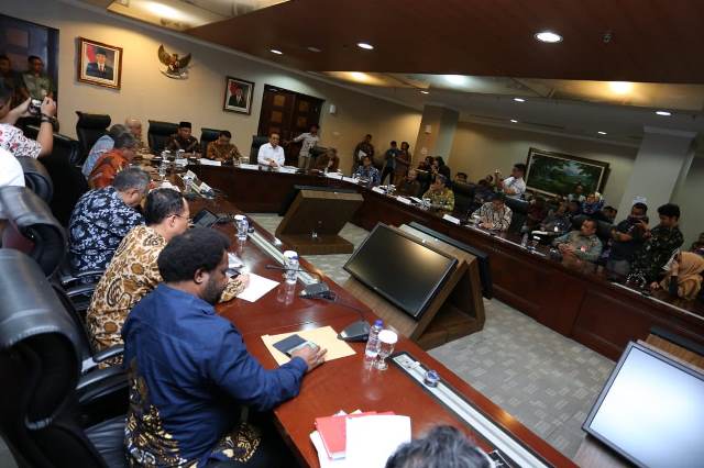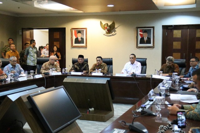 Menteri Pendayagunaan Aparatur Negara dan Reformasi Birokrasi (PANRB) Syafruddin menggelar jumpa pers bersama di Kantor Staf Kepresidenan (KSP), Jumat (21/09). Dalam kesempatan itu, Menteri mengatakan, pemerintah segera merampungkan Peraturan Pemerintah tentang Pegawai Pemerintah dengan Perjanjian Kerja (PPPK). Hal ini untuk memberi kesempatan masyarakat berusia lebih dari 35 tahun yang ingin mengabdi untuk negara. Adapun seleksi PPPK akan dilakukan setelah seleksi CPNS tahun 2018 selesai. Hadir dalam kesempatan tersebut Kepala KSP Moeldoko, Menteri Pendidikan dan Kebudayaan Muhadjir Effendy, Kepala Badan Kepegawaian Negara (BKN) Bima Haria Wibisana, Kepala Badan Pengawasan Keuangan dan Pembangunan (BPKP) Ardan Adiperdana, Sekretaris Kementerian PANRB Dwi Wahyu Atmaji, Deputi SDM Aparatur Kementerian PANRB Setiawan Wangsaatmadja dan sejumlah pejabat terkait.