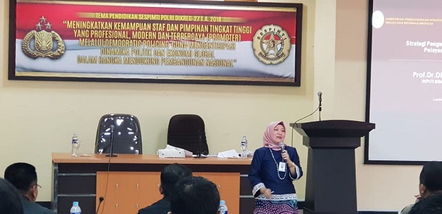 Deputi Bidang Pelayanan Publik Kementerian PANRB Diah Natalisa menjadi dosen tamu dalam kegiatan Sespimti Polri Dikreg 27 tahun 2018, di Bandung, Kamis (09/08). Dalam kegiatan Sespimti Polri yang diikuti 47 peserta tidak hanya dari Polri tapi juga dari TNI AD, dan AL. Diah menjelaskan bagaimana standart layanan yang harus dilaksanakan oleh para penyelenggara negara.