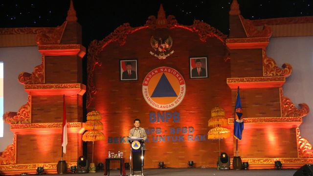 Menteri Pendayagunaan Aparatur Negara dan Reformasi Birokrasi (PANRB) Asman Abnur menghadiri Rapat Kerja Nasional (Rakernas) Badan Nasional Penanggulangan Bencana (BNPB) 2018 di Nusa Dua, Bali, pada Kamis (22/02). Menteri Asman disambut oleh Deputi Rehabilitasi dan Rekonstruksi BNPB Harmensyah dan Direktur peralatan Rustian.