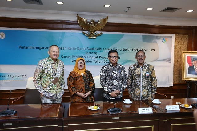 Kementerian Pendayagunaan Aparatur Negara dan Reformasi Birokrasi (PANRB) melakukan penandatanganan Perjanjian Kerja Sama Swakelola tentang Survei Penilaian Tingkat Kesejahteraan SDM Aparatur Tahun 2018 dengan Badan Pusat Statistik (BPS), di Kantor Kementerian PANRB, Jumat (03/08). Penandatangan dilakukan oleh Kepala Bagian Perencanaan Kinerja dan Anggaran Kementerian PANRB Adi Junjungan, dengan Sekretaris Utama BPS Adi Lumaksono, dengan disaksikan oleh Deputi Bidang SDM Aparatur Kementerian PANRB Setiawan Wangsaatmaja, dan Sekretaris Kementerian PANRB Dwi Wahyu Atmaji.
