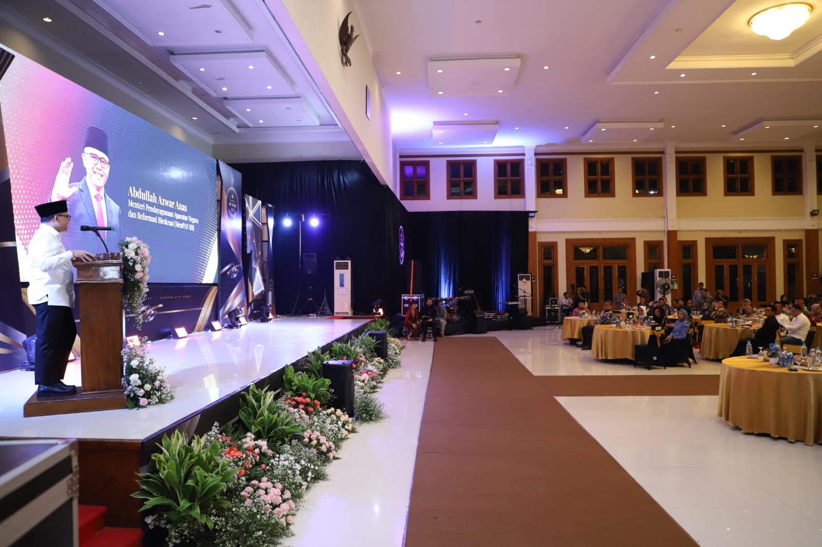 Menteri Pendayagunaan Aparatur Negara dan Reformasi Birokrasi (PANRB) Abdullah Azwar Anas menjadi keynote speaker pada acara Radar Bromo Award 2024, di Kabupaten Probolinggo, Rabu (28/02). Menteri Anas mengapresiasi Radar Bromo yang termasuk dalam Jawa Pos Grup karena ikut mempublikasikan reformasi birokrasi berdampak dari sisi publikasi. Menteri Anas berharap, penghargaan ini kedepannya bisa semakin berkembang sesuai dengan reformasi birokrasi tematik yang telah dicanangkan. Menteri Anas meraih penghargaan Terobosan Akselerasi Penyederhanaan Layanan Kepegawaian dan Pendirian MPP Digital.