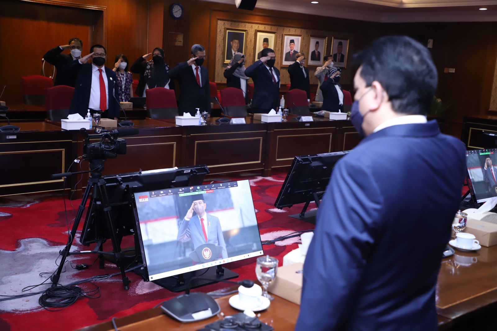 Menteri Pendayagunaan Aparatur Negara dan Reformasi Birokrasi (PANRB) Tjahjo Kumolo menghadiri Upacara Peringatan Hari Kesaktian Pancasila secara virtual, Jakarta, Jumat (01/10). Peringatan yang digelar secara daring ini tetap mematuhi protokol kesehatan untuk mencegah penyebaran Covid-19.