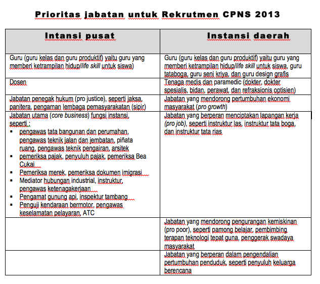 Lebih lanjut Rusdianto mengatakan, untuk instansi pemerintah pusat, jabatan yang diprioritaskan adalah guru, dosen, penegak hukum, serta jabatan utama fungsi instansi. Sedangkan jabatan yang diprioritaskan untuk instansi daerah adalah guru, tenaga medis dan paramedis, jabatan yang mendorong pertumbuhan ekonomi, menciptakan lapangan kerja, mengurangi pengangguran, serta jabatan yang berperan dalam pengendalian jumlah penduduk.